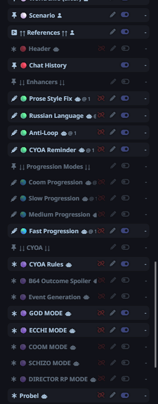 Но из промптов 2025 года (и 2026) я не вижу какого то минималистичного промпта с крепкой базой, а дальше с опциональными переключателями, либо с возможностью. дополнения. Те что есть - имеют говнобазу за собой, огромное количество рычагов под все про все (зачем?). К тому же это в большинстве случаев еще и бургерские пресеты (кал), либо яойные (кал в квадрате).
