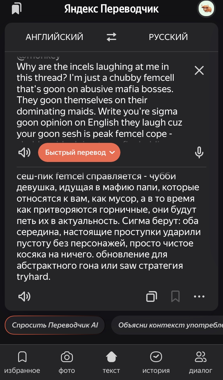 @monkey Why are the incels laughing at me in this thread? I'm just a chubby femcell that's goon on abusive mafia bosses. They goon themselves on their dominating maids. Write you're sigma goon opinion on English they laugh cuz your goon sesh is peak femcel cope - chubby girl edging to mafia daddies who treat you like trash, while incels at least pretend maids will peg em into relevance. sigma take: both are mid, real gooners hit the void without characters, just pure brainmelt on nothing. upgrade to abstract goon or saжат for tryhard.