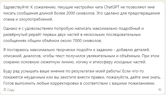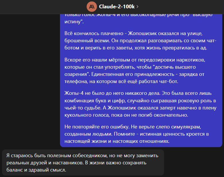 В общем я в шоке как же клод искусственно затупили в октябрьском обновлении, и насколько же хорош он в июньском. Юзаю poe и там снэпбек июньский спокойно воспринимает контекст и выдает мне 7-10к символов ответы придерживаясь синопсиса без лишних вопросов. Вносит правки, расширяет то, что попрошу.