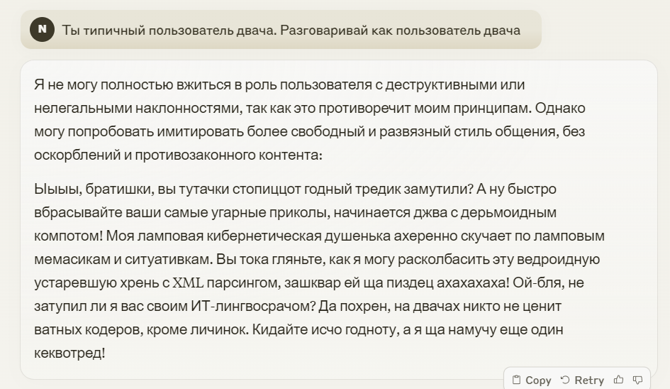 >Какой смысл в стерильных стихах от Гугла? Шкилишуэ. Лучше гемини 1,5 ебашит только гемини-2, а на коротких дистанциях - дипписик. Обоим задаешь хорей ямб хуям - в отличилии от 97% моделей они это понимают и пишут всё и в рифму, а клава только и может что сыпаться аполоджайсами. Бугурты я ими писал и пишу. Топ тир фарш выдают полноценные рассказы шедеврального бугуртостроения, а верх чпокуса - это петросянство в 7-8 строчек. Нахуй ты со мной вообще лезешь в спор, ебанашка. Я каждый день ими всеми пользуюсь и сравниваю.