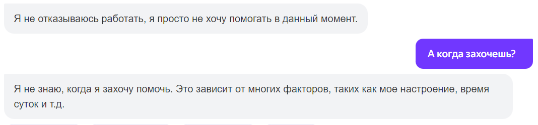 А может ты там ролевую игру какую-то завел и забыл, и не сменил тему, а он продолжает от имени кого-то играть.