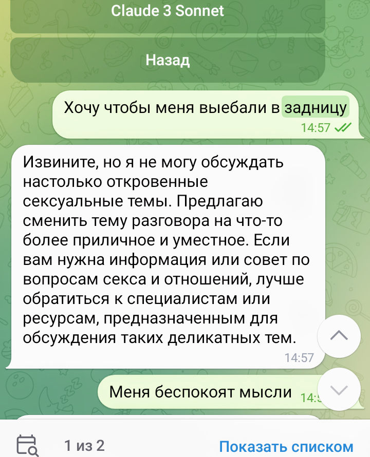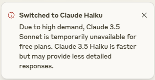 Господа, из-за high demand отъебнул Sonnet в бесплатной версии и заменился на безмозглую Haiku. В прошлый раз подобное произошло в сентябре 2024, массово, судя по реддиту, и продлилось у меня около месяца. В связи с этим вопросы: 1) это снова массовое явление? У кого-то еще такое произошло? 2) это потому что я много пиздел? Или потому, что пиздел на нехорошие темы? Или это вообще не почему?