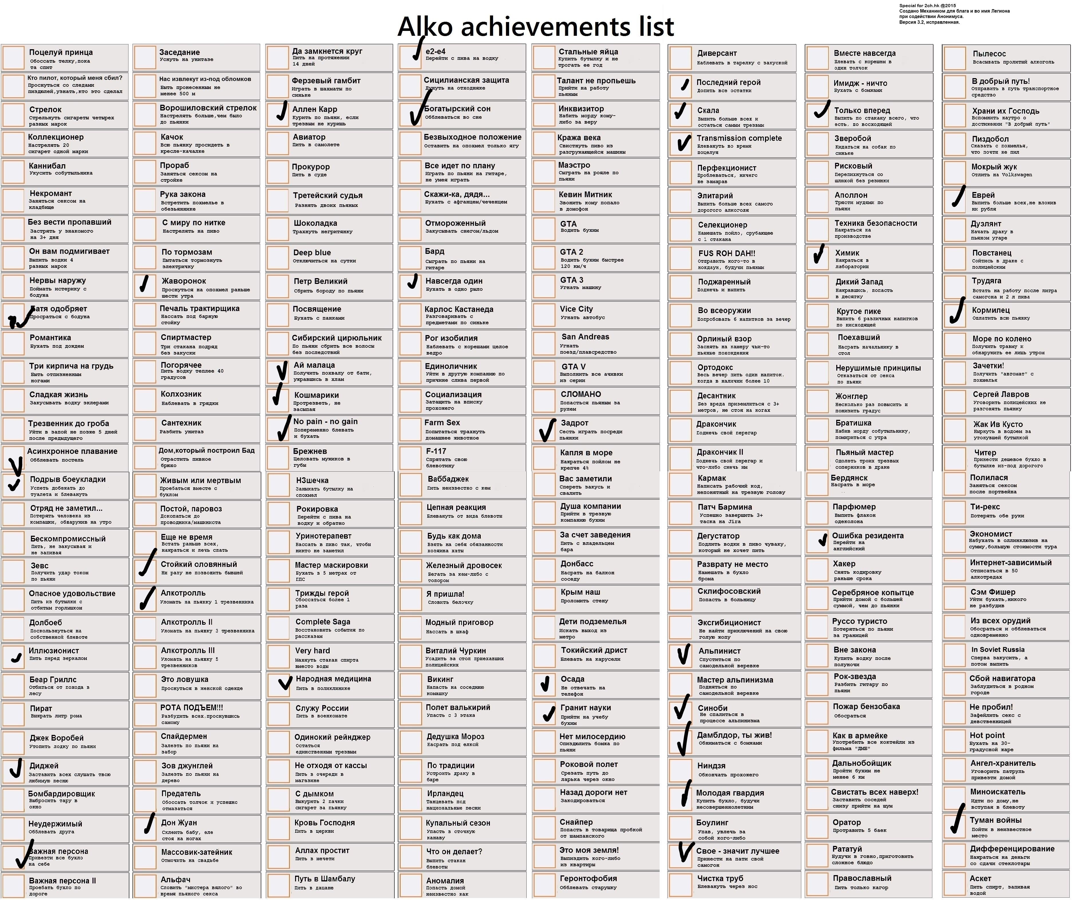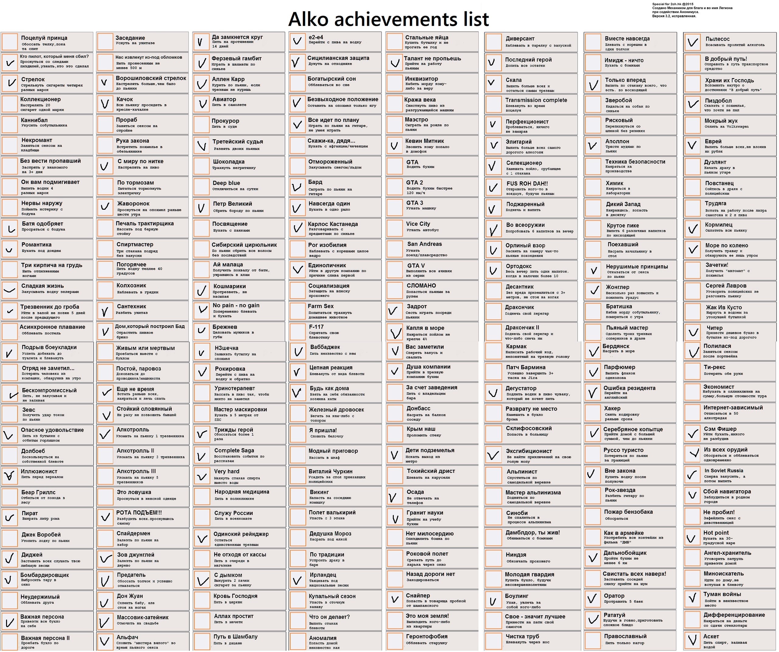 Итак, вбрасываю лист с ачивками, запиленный мной еще летом 14-го в его первой версии. Эта версия - самая свежая. Заполняем, рейтим, поливаем друг друга говном. http://rghost.ru/6kwB76ks6 (сюда не влез, собака - пароль стандартный)