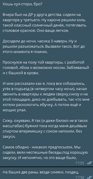 привет анон давеча получилось так что я жёстко набухался с родственниками. Пили самогон, который делал мой свояк. После трёх рюмок меня будто отрубило. Очнулся, после того как проблевался у родителей дома и охуел. Оказывается я пробыл в забытье около 8 часов Все эти часы я творил полную хуйню. Подрался с другом, который пытался меня удержать, ссал на глазах у всех, порвал хорошие штаны и сидел в трусах на асфальте. Ничего из этого я не помню, для меня пролетела словно секунда. Собственно, вопросы: Что это было? Прочитал про какое-то паталогическое опьянение и всё. Сейчас хуярю пиво периодически и винцо. К крепкому боюсь даже подходить. Можно мне вообще крепкое пить, анон?