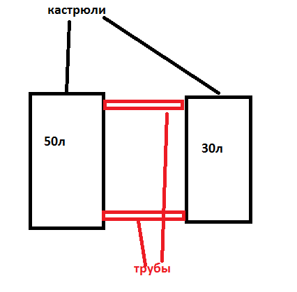 Всем бобра. Если сварить между собой трубами 2 кастрюли как на картинке, то если поставить тэн в одной и греть, другая ведь тоже будет прогреваться примерно так же? Нужна емкость на 70 литров а нету. Будет работать, как думаете?