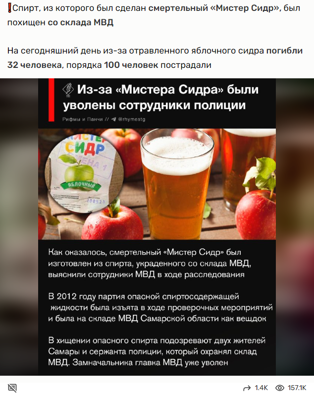 Учитывая такие показатели можно утверждать с 99% вероятностью, что никакого процесса брожения там не было, иначе объемы смертельной дозы должны повышаться в разы, что было бы маловероятно при таком количестве погибших. А значит состав Мистер Сидр был совсем иным, скорее всего там был некий ароматизатор типа дюшес, лимонная кислота, спирт и продавали все это под видом напитка типа Яблочный.
