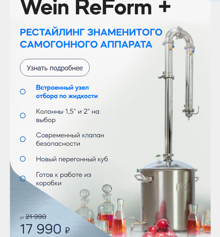 Вкатываюсь в этот тред на Вейн реформ плюс с автоматикой, всем привет, бродяги! Закину пару мыслей - реформ плюс неплохой аппарат, пересел с дидова прямотока, качество выросло в разы. Автоматика и узел отбора по жидкости - отличная тема, мне очень понравилось. Добился 95% в струе с автоматикой на протяжении всего отбора тела. использовал спн Селиваненко, брал в Яндексмаркете 3×3 размер, кажется. Изготовитель положил Рпн, решил его не использовать вовсе. Забил спн одну родную царгу 50 см, думается, если куплю ещё одну и тоже забью спн - получу 96.6% Из минусов аппарата - родной клапан автоматики полное говно, на Али такой 200 рубасов стоит. На второй перегонке начал разваливаться, отошёл буквально на десять минут, прихожу, а у меня из узла отбора уверенно капает спирт прямо на горячий куб, моментально испаряясь. Привязывайте доохладители если они держатся только на силиконовом шланге!