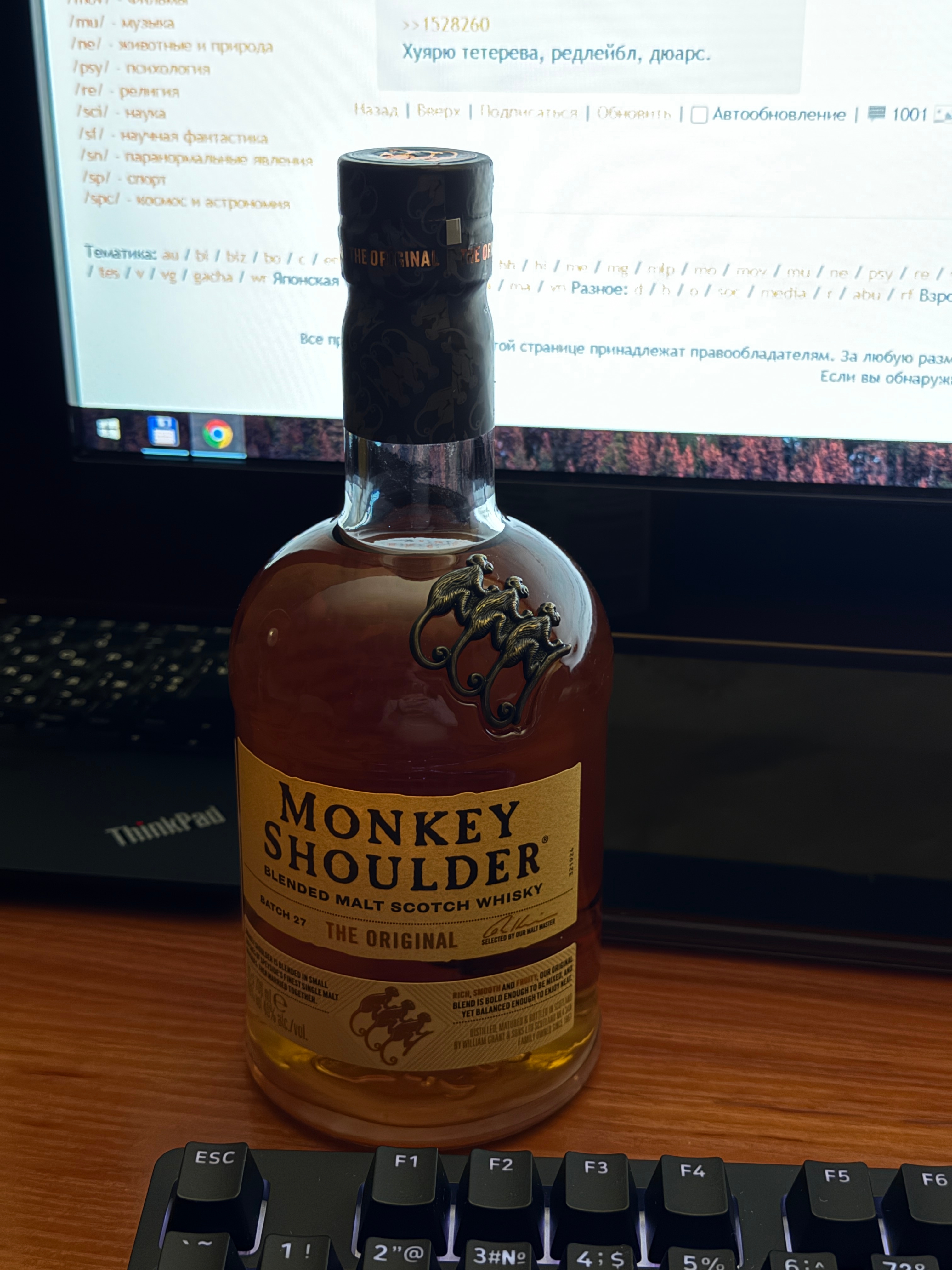 >>1467628 >Кайфуют тут от блек лейбла за 2200 и проибишена. А это я и был, кек. При моих обьемах потребления, если я буду брать молты по 10к, то буду работать исключительно на вискарь, так что лечим душу Проибишеном.