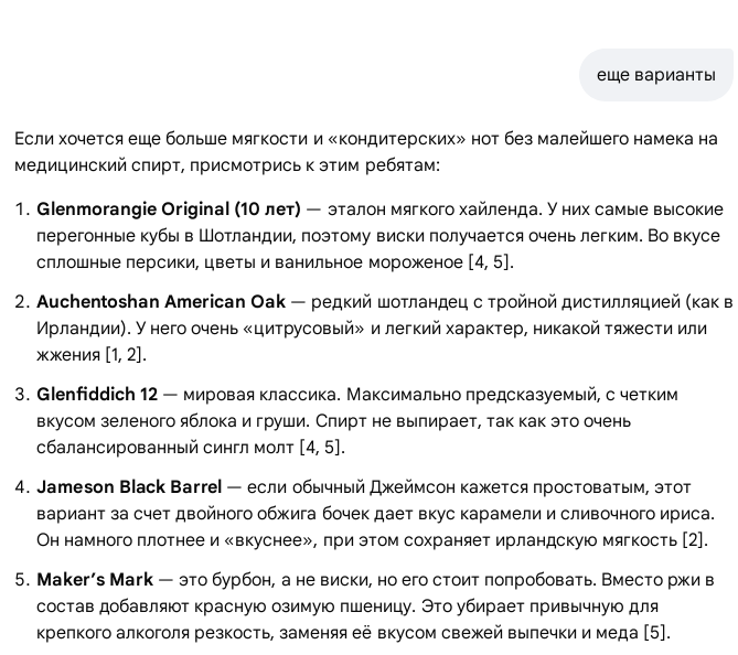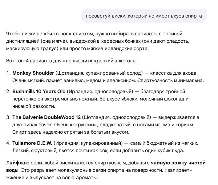 лох это судьба. Это каким надо быть лохом чтоб попробовавши несколько вискарей вестись на это ? Ты купил 10 летний односолодовый виски выдержанный в бурбонных бочках (возможно даже от мейкерс марк), ты ожидал жидкое ванильное мороженое без вкуса алкоголя ? Кто тебе виноват в том что ты повелся на маркетинговое наебалово, при том что тебя здесь предупреждали ? хочешь вкусный виски ? купи хороший сингл малт овер 16 лет а не слушай херню которую тебе ии выдал >А то пьешь Беллс за 500р - сивушная спиртяга, Гленливет 12 за 6к - такая же сивушная ты самогон пробовал ? если ты не можешь отличить муншайн от беллса от гленливета и для тебя по вкусу одна спиртяга то это уже твои проблемы