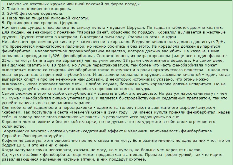 >>362208 Охуеть бля, 100 флаконов по 50 мл это одного чистого спирта 4 литра. А теперь посмотри сколько фенобарбитала в корвалоле и посмотри какая у него смертельная дозировка, дегенерат ебаный. Хотя лучше не смори и выжри его побольше.