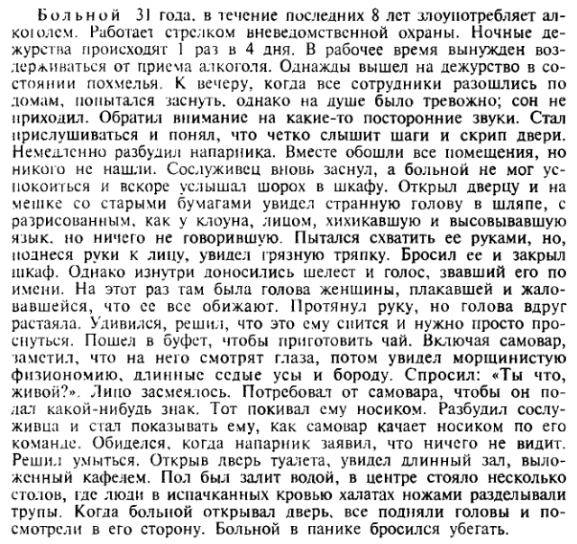 >>511638 Мне 27, сильные запои происходят последние 2 года. Сначала день-два, потом три-четыре. За этот год пережил три «недельных» (до 10-ти дней) запоя. Дак вот хочу описать самый страшный кошмар в моей жизни – отходняки от запоев. Сначала ты очередное утро просыпаешься с лютым перегаром во рту, в мокрой постели, промокшей от собственного ледяного пота, вонючего как компостная яма. Понимаешь сначала, что дальше пить просто не можешь. Встаёшь с кровати, в голове шум, внутри ливер не то чтобы трясётся, он просто содрогается, мышцы дёргаются сами по себе, руки трясутся так, что не можешь попить воды из чайника… Слоняешься туда-сюда пару часов, после которых тело переходит в состояние близкое к смерти – бросает то в жар то в холод, ледяной пот покрывает всё тело, волосы и ногти, кажется, поменяли структуру, а в голове появляется шум тысячи поездов и адская головная боль. Чтобы стало хоть чуть чуть легче, нужно выпить. Хотя бы чего нибудь, хотя бы чуть чуть. Но ни желудок, ни печень, ни один твой орган не может принять ни капли спирта. Но надо… Выпиваешь немного, тут же обнимаешь унитаз и блюёшь так, что кажется сейчас желудок вылезет из глотки. Ни с каким отравлением это даже невозможно сравнить. Через несколько часов мучений, когда ты хочешь тупо сдохнуть от собственного организма, алкоголь наконец-то усваивается и тебе становится немного полегче. Начинаешь потеть ещё сильнее, сердце сходит с ума от количества собственных ударов, но мясотряс внутри как будто успокаивается. Начинаешь пить чаи, кофе, соки, очень много минералки… Чуть-чуть сьедаешь чего-нибудь, желудок начинает работать… Вроде бы как становится полегче, ложишься и тупо отлёживаешься… Но вот, ближе к вечеру, утренний алкоголь исчёз, и тут начинается самое страшное, самый дикий кошмар, который я когда-либо испытывал в свой жизни. По сравнению с этим кошмаром всё вышеописанное – просто цветочки. Начинает казаться, что кто-то есть в комнате. Что кто-то прошёл мимо, кто-то очень страшный и неизвестный. Ты чётко понимаешь что за тобой наблюдают со стороны, начинаешь оглядывать комнату… Сначала никого не находишь. Потом где-то в поле своего края бокового зрения начинаешь видеть такие образы, которые раздирают тебя изнутри, приводят тебя в панику, в крайне страшное состояние. Ты не можешь понять правда это, или нет, не видишь грани между реальностью и своими глюками, сном и явью. Туча слов, помимо шума в твоей голове, постепенно исчезает и ты начинаешь слышать ужасные голоса, которые говорят вполне ясно и членораздельно. Включаешь везде свет, музыку, телевизор, только чтобы наполнить немного квартиру какой-то жизнью. Возникают разные образы перед глазами, какой-то странной непонятной твари, которую ты видел только в своих фантазиях, когда представлял сценарий очередного фильма ужасов. Наступает сильнейшая паника, от этого не убежать, не спрятаться. Начинает казаться, что на тебя нападают неизвестно кто, а ты беззащитен. И при всём при этом самое страшное – невозможно понять что это только лишь твоё воображение. Кажется что это всё на самом деле – чувство неизбежности, парадокса и кошмарного бытия. Чтоб хоть как то от этого избавиться, обжираешься снотворных пилюль, сильно рискуя не проснуться завтра, но другого выхода не видишь (лично я так сделал, мож не прав был). Тело начинает засыпать, хот