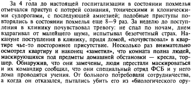 Началось все в мой д\р. С парнями на работе у меня в кабинете отметили. (я тогда зам.дир спорт-комплекса работал). Поехали в клуб, в другой (я в те года любил все эту херь тусовочную). В понедельник вышел на работу, но похмелялся весь день, под вечер на такси в полумертвом состоянии домой. По дороге в магаз. Жена с детьми в отпуске у бабушки были. На работу забил, знал, что отмажусь леко. Позвонил знакомым шлюхам. Бухали, шпилились втроем дня три. Потом их не стало, видно деньи кончились. Порылся по сусекам, нашел денег и дальше в путь. Уже с рогами и копытами по квартире бродил. Все знают, что в этом состоянии деньги все равно кончаются. А у меня на балконе канистра со спиртом стояла. Хрен знает зачем домой привез. Обычно на работе стоит. С мужиками расчитаться за разгруз-поруз, трактористу и т.д. А тут захожу на балкон, а она там. Ну и понеслось............... Память пришла вот как: Сижу на диване, а передо мной на креслах сидят Дукалис, Соловец, Ларин и Волков. И мы обсуждаем, как я снялся в очередной серии. Болтали, пили спирт. Потом я уже один сидел у телевизора, а там шли титры, час или больше шли титры. А я ждал, когда себя в титрах увижу. О чередной раз очнулся и понимаю, что не могу пошевелиться. Поворачиваю голову а рядом олова новорожденного ребенка лежит без тела. Я закрыл глаза от ужаса. Потом открыл, что бы посмотреть еще раз. Поворачиваюсь, а это не голова а моё плечо. Я вообще в акуе! Двигаться не могу. Как то на руках дополз до стола и выпил. Очнулся от того, что меня пацаны на одеяле вниз тащат. Я на 5м этаже живу. Они в дверь не попали и вызвали вышку, через балкон залезли и в реанимацию меня. Дня 3-4 не двигался. Потом оклемался не много. Врач сказал, еще бы чуть чуть и....