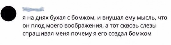 Еще один шажок по разрушению собственной психики сделал сегодня, поздравьте меня. Впервые снились кошмары сегодня ночью, хотя употребил бутылку водки на ночь. Бля в пьяном коматозе такие сны еще страшнее смотреть, чем на отходняках этих алкогольных. Збс, катимся дальше.