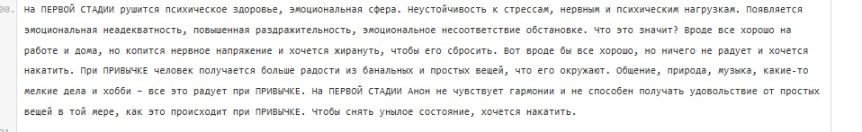 Хуй вас знает чего вы срываетесь через месяц, тем более через джва. У меня наоборот на вторую неделю возникло желание сжечь нахуй все, как будто ты болел в ознобе и бреду, а тут вдруг вылечился, пришел в себя, очнулся и ахуел. Сменить жилье, одежду, завести не маргиналотян, взять повозку хотя я никогда не был повозкоебом. Ну хотя бы взять новый велосипед если не повозку. Прибрал дома, дико заебался выгребать говно. Перебрал вещи, выкинул очень дохуя. Оделся нормально, отек с лица сошел и стал похож на человека. Тяны на улице чето спрашивать начали. Подумал о том что надо больше золота, и надо бы работку подоходнее, хотя по факту понимаю что сейчас не время и надо бы просушиться с пол года минимум. Подумал о том что мое физическое состояние до которого я себя запустил меня мало устраивает и надо бы скинуть лишний вес. При взгляде на пьющих отвращение как от курящих если не куришь, и люди чаще всего плохо выглядящие, пахнущие и ебануто ведущие, курильщики бегающие по ночам курить, бегающие в -30 на улицу потому что зависимость. Как смотреть на нариков когда ты сам не нарик и не важно курево, алкашка или крокодил, один хрен это маргинальная хуита как пересидки с кучей портаков и гнилыми зубами. В общем противно это все синее стало, от одного запаха чужого перегара просто воротит и хочется блевать. Попробовал как-то взять пива, выпил и мне реально было прикольно час-два, а потом хуево сутки и просто говенно еще пару дней. А в замен алкашки, уже писал выше нормальный сон, самочувствие, обоняние лучше, голова сильно светлее - реакция, работоспособность, внимание, стрессы меньше ебут; плюс отношение к непьющему совсем другое у окружающих, опять же время и силы есть на что-то кроме работы. Еще коллекцию музыки и кина перебрал, тоже много чего пришлось выкинуть, особенно сильный тригер это музыка которая доставляла под бухло и кино, это пиздец. Пришлось отказаться от большинства сериалов тк в них постоянно курят и пьют так как будто это ахуенное блажество. Труднее всего наверное было пересилить себя и не сесть на заместительный хуй типа кофе, трав или других веществ, вот на это реально тянуло, ебучее ощущение некайфа, того что чего-то не хватает, хотя на деле спокоен, сыт, выспат и все окей, потом уже допер что это иррациональная хуита и зависимость говорит что пьяным то весело и заебись было, но это все наебка зависимости, постабстнентный синдром или вроде того. Короче конкретно так меняю жизнь, переставляю приоритеты, не резко на 360 градусов стать качком лидером митол группы, а по мере сил, по капельке, по помаленьку наращиваю преимущества, вытесняю алкашку и прочую хуиту из своей жизни, но тут важно думать головой а не просто слушать других и делать как они.