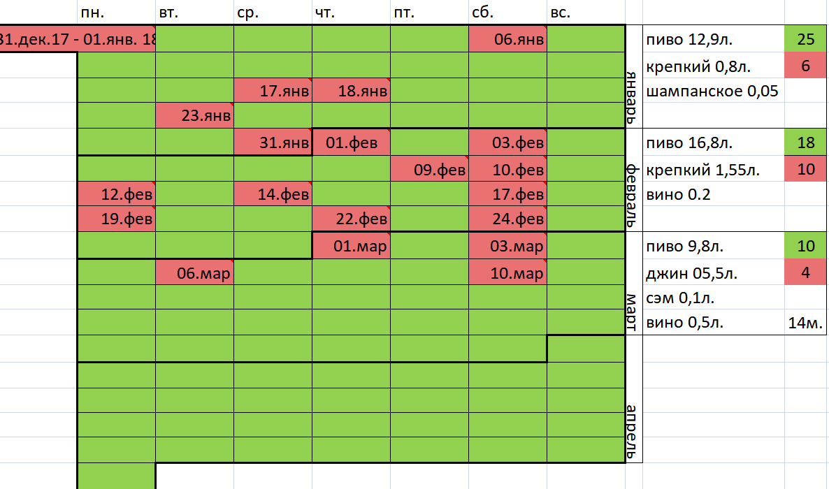 Последние 3 месяца веду учет всего выпитого алкоголя, не пропускаю даже дни, где я просто выпил пол кружки пива. Что у меня вышло вы видете на пике. Что можете сказать, я уже алкаш или еще не совсем? 22 лвл, а выпиваю где-то с 17.