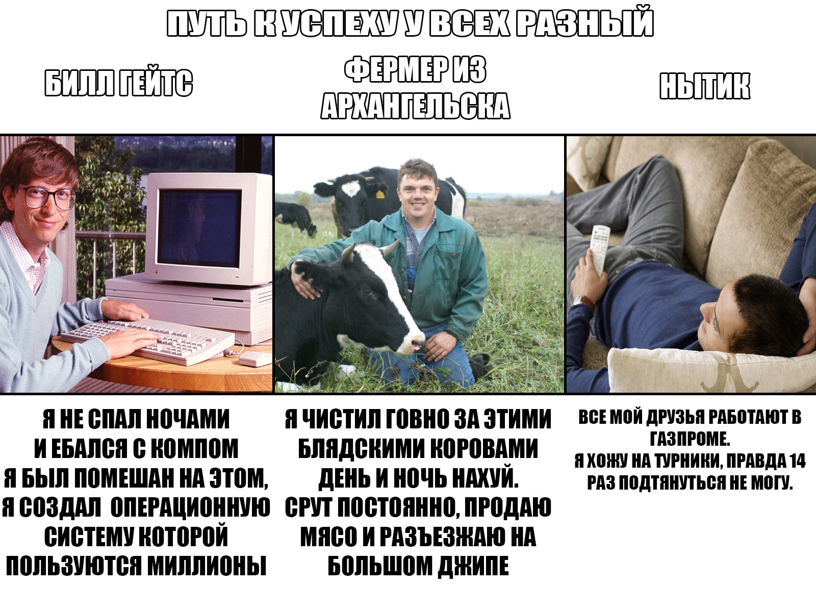 >>535581 >Бухает всю жизнь наверное, курит, передние зубы разрушены, работает на дно работах за 15-18к. В чем наши отличия? В том, что он пьет на свои, а ты небось у бабки стреляешь на бухло. Но есть у вас и сходство - вы оба родились не в семье олигархов и, очевидно, без выдающихся талантов. Поэтому для создания комфортных условий бытия нужно упорно и настойчиво вьябывать.