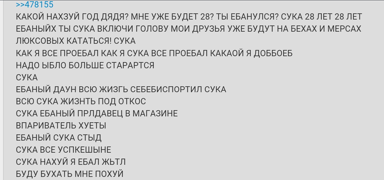 Я 30 лвл, листва. Работаю на дноработе за 12 к, и то устроил меня на эту работу родственник. Живу всю жизнь в глухой мухосрани с мамкой в квартире. Нет пеки, капчую с разбитого телефона, взятого с рук по дешевке. Боюсь людей и близко к себе никого не подпускаю в плане общения. Большую часть жизни сычевал дома, и это были лучшие времена в моей жизни. И я понимаю, что нихуя хорошего уже не ждет меня. Так и сгнию в этой сычевальне, впрочем я и не против. Но почему мне жалко этого гражданина с бугуртом от одноклассников и родственников? У него вроде и все есть для более менее человеческого существования. Есть образование, есть опыт работы хоть где то. Есть 100+ к ну или было, с которыми в принципе можно что то начать мутить для улучшения жизни. Еще у меня никогда не было зависти к другим людям и я никогда не сравнивал себя с другими, мне было похуй. Может быть по этому я спокоен за свое червепидорное существование и не волнуют чужие машины и квартиры.