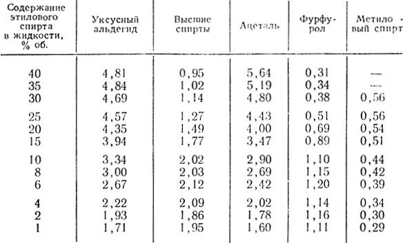 Альдегиды в мг/л 6,5 Эфиры общие в м-экв/л 6,0 Летучие кислоты в г/л 0,42 Фурфурол в мг/л 7,5 Высшие спирты в г/л 0,40