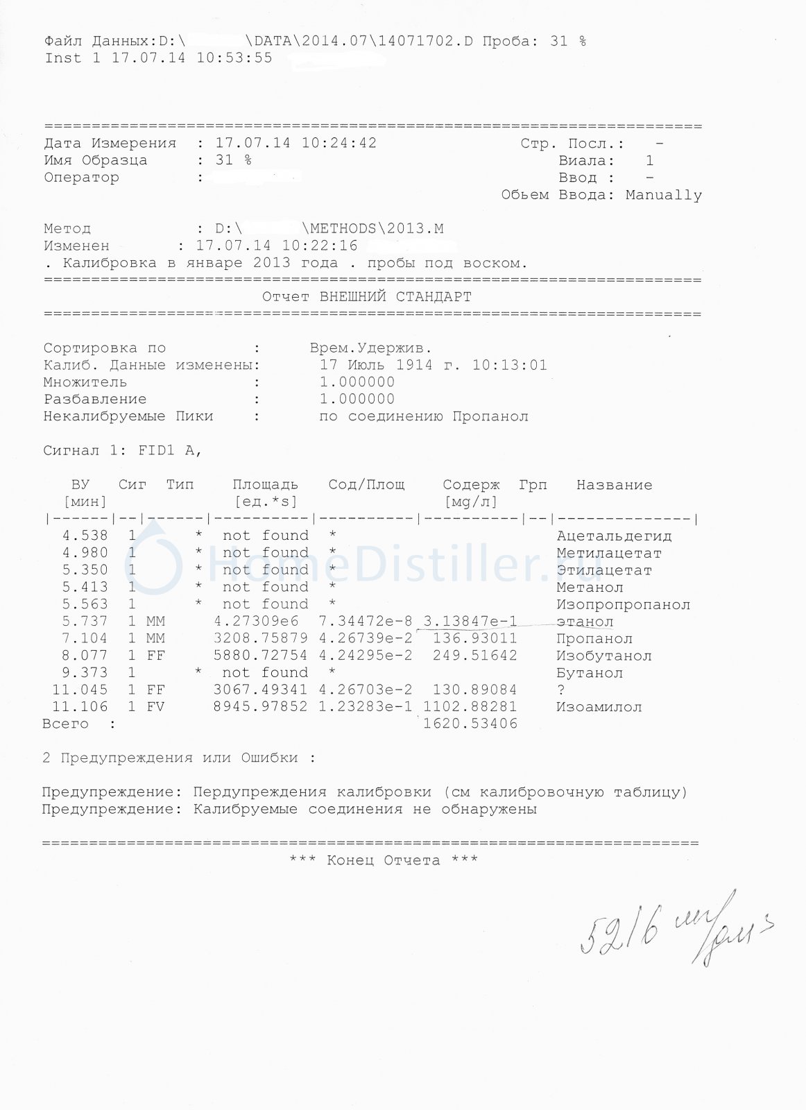 Спирт-сырец 1600 л Головной погон 40 л Средний погон 530 л Хвостовой погон 335 л Остаток в кубе 695 л