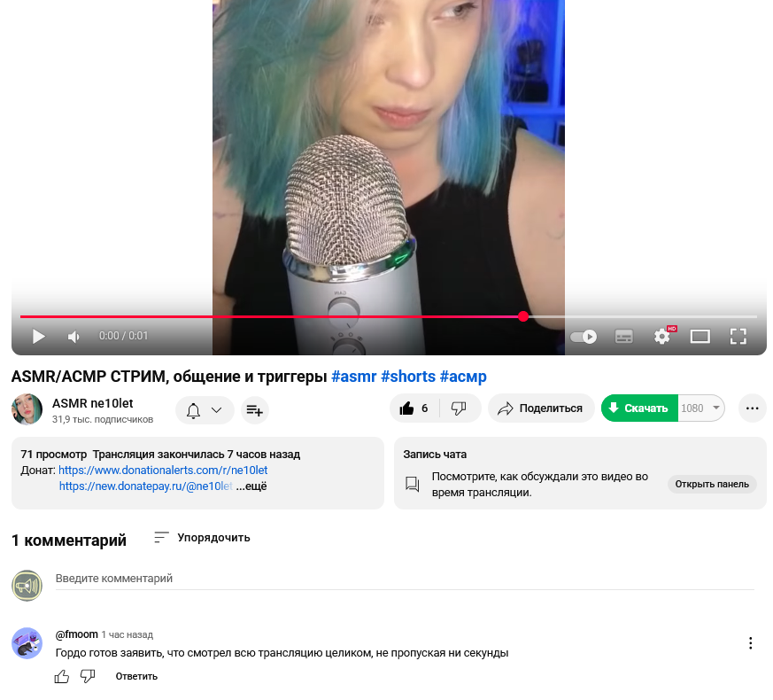 Наверное, многие ее видели на твиче, когда она стримила в АСМР разделе. Потом, она, внезапно, перестала там стримть (возможно как-то связанно с обновлениями правил твича). Меня она не интересовал ее контент за пределами, собственно АСМР. Суть вот в чем. После очередного обновления правил на Ютубе все видосы с ее АСМР контентом были заблокированны\удалены. Я, к своему несчастью и недальновидности, не схоронил их. Теперь вот лажу по инетам в поисках этих видосов, ибо ее АСМР заходил мне как ничто другое. Так вот, может кто-то из вас сохранил их? Буду благодарен, если у кого-то что-то завалялось.