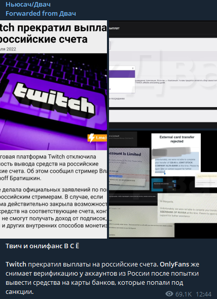 >>101789 Блять я понимаю желание навести панику, но даже в этой "новости" непроверенной (я не говорю, что это не правда, но нужна новость самого twitch) написано, что на счета российских банков попавших под САНКЦИИ.
