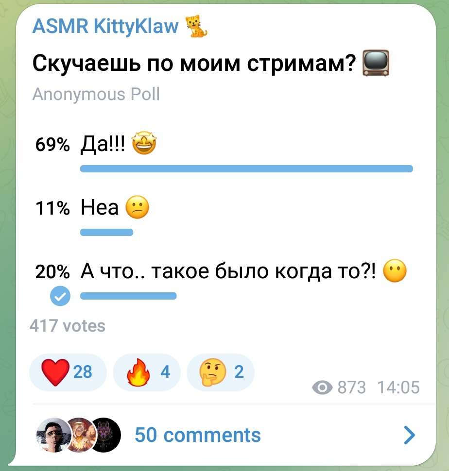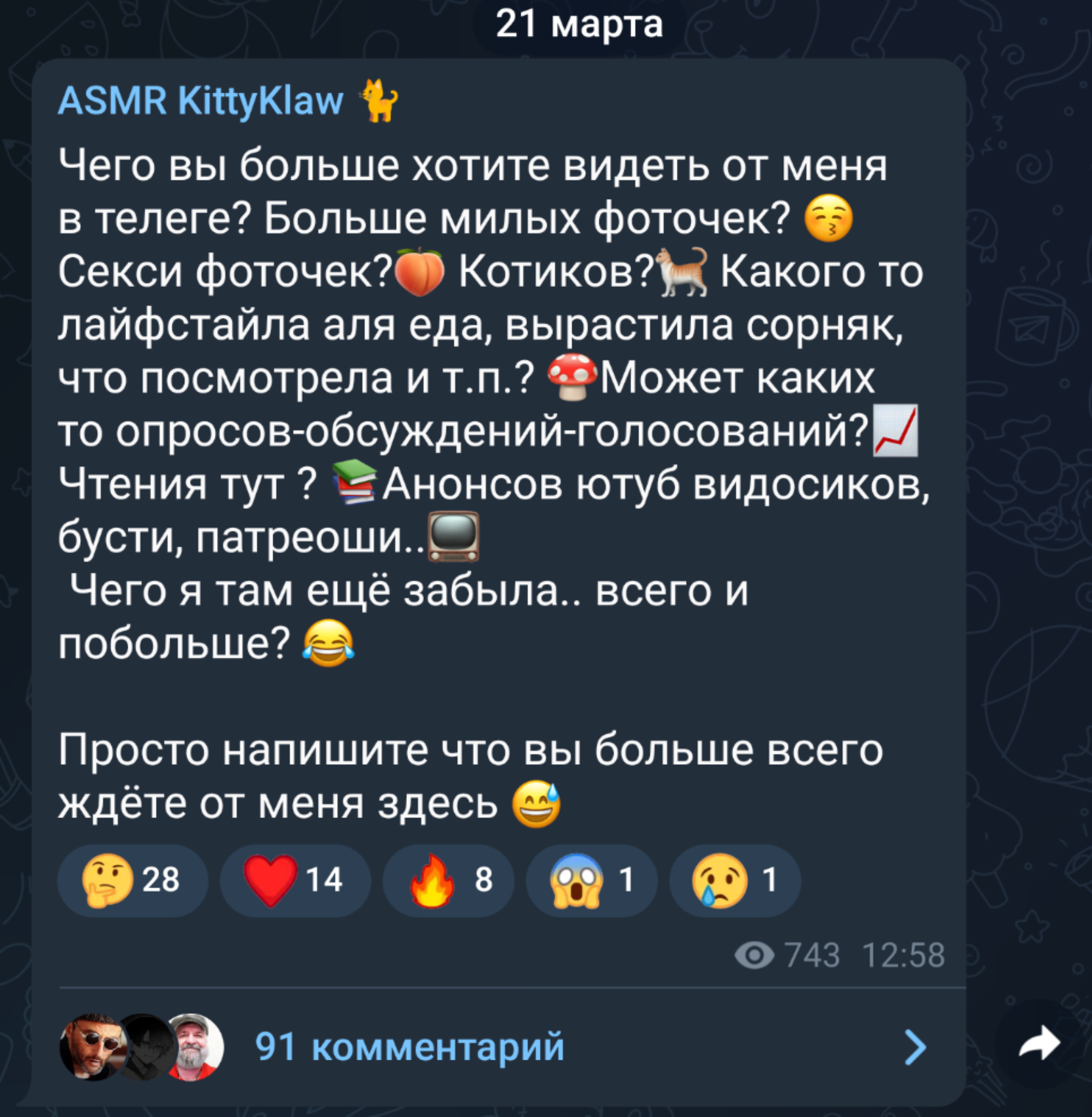 >>104144 В чем проблема. Зайди к ней в телегу да спроси свой вопрос. Она довольно часто отвечает и общается с аудиторией. На разные темы и на удивление довольно открытая. Тем более такой плёвый вопрос. Только делай это в свежих последних постах, а ещё лучше выдели ее по тележному нику. Чтоб увидела на верняка.