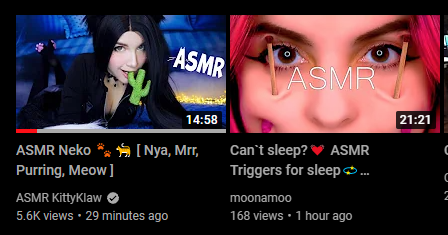 >>106682 Да я так просто спросил насчёт видосиков - к тому же большинство из них мне не заходят, я их тупо скипаю. У неё, например, практически вообще нет близкого шёпота с ушка на ушко, что мне как раз нравится. А просто триггеры с предметами - не интересно. Так что и мурашек даже от неё не получаю. Насчёт всего остального согласен с тобой - то что все эти асмртутки делают контент в первую очередь ради заработка, я думаю, это ни для кого не секрет.
