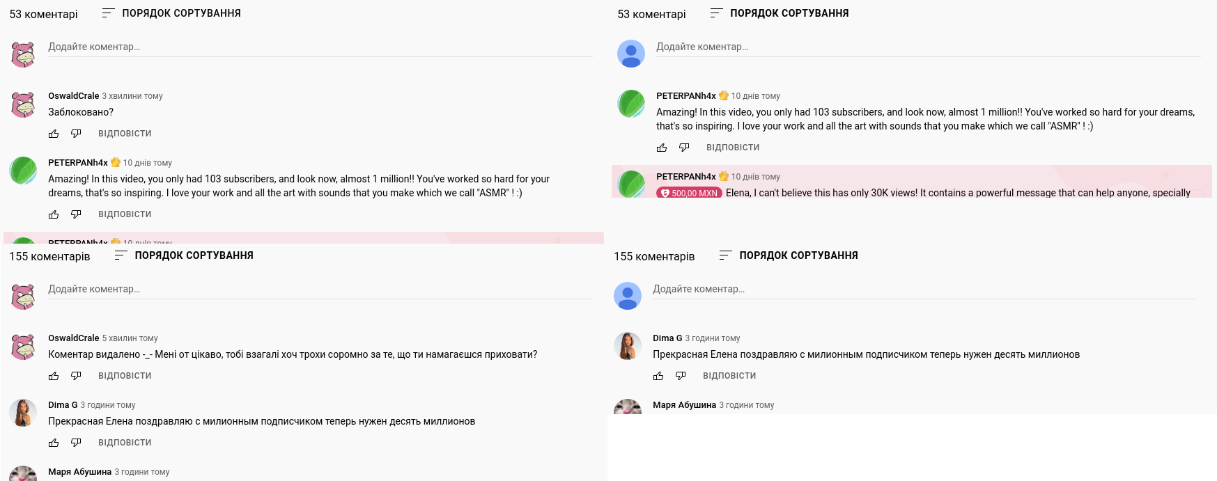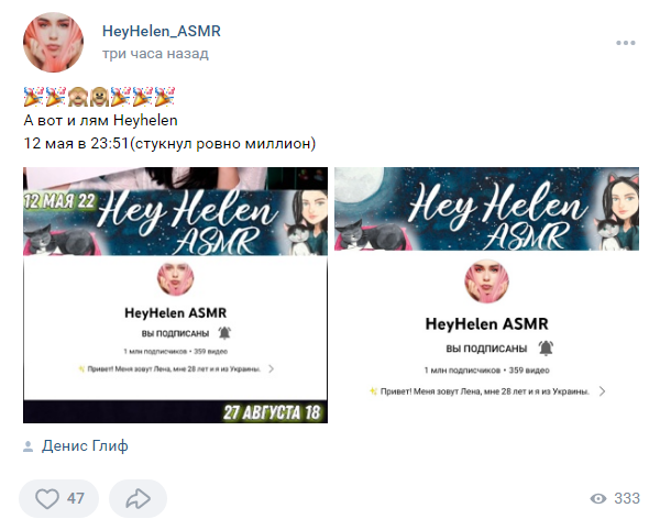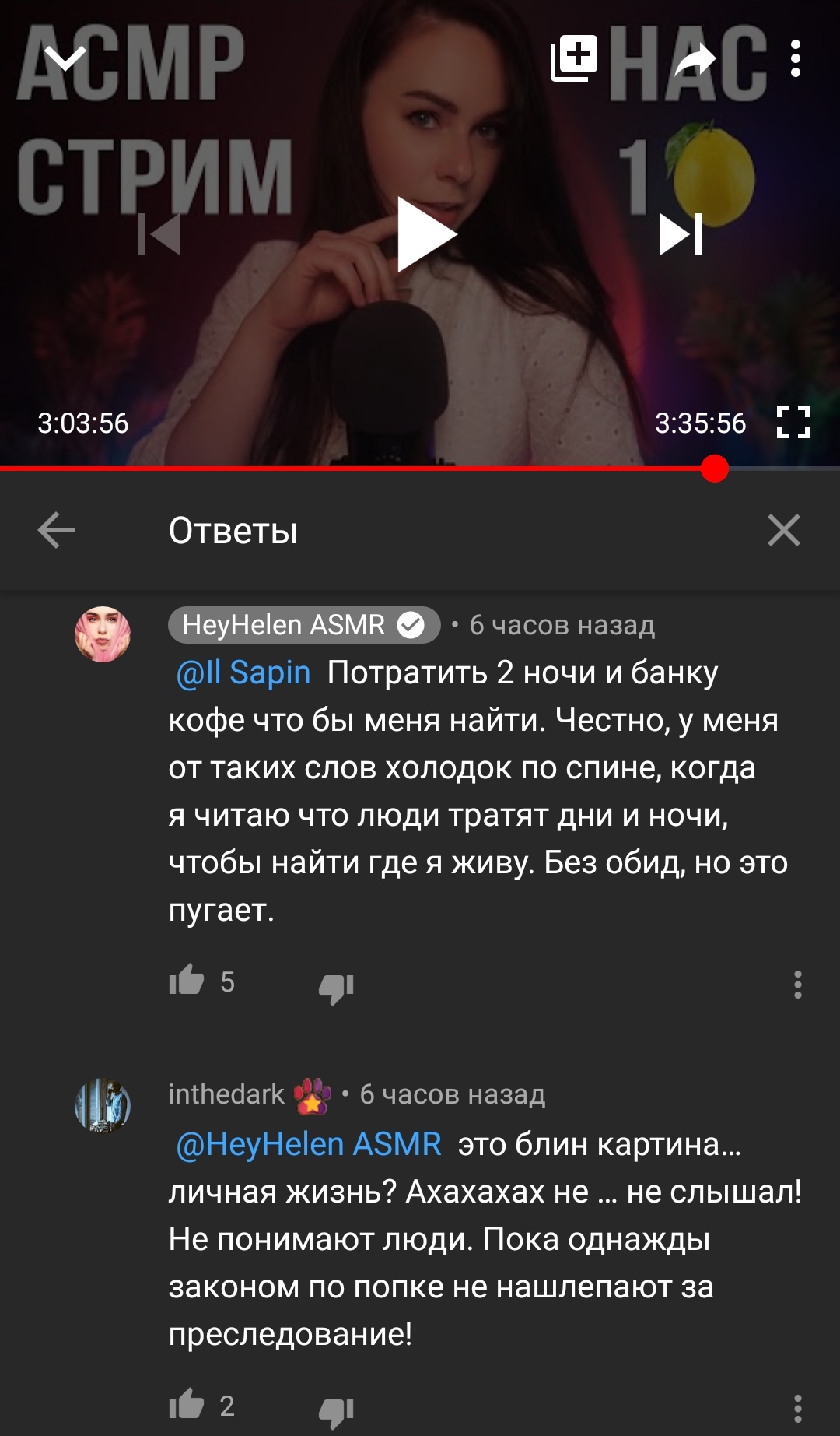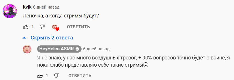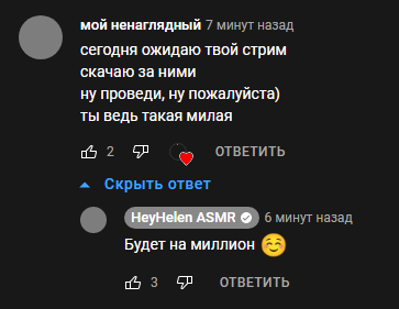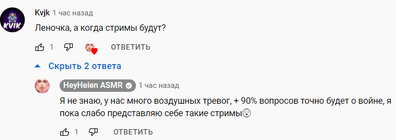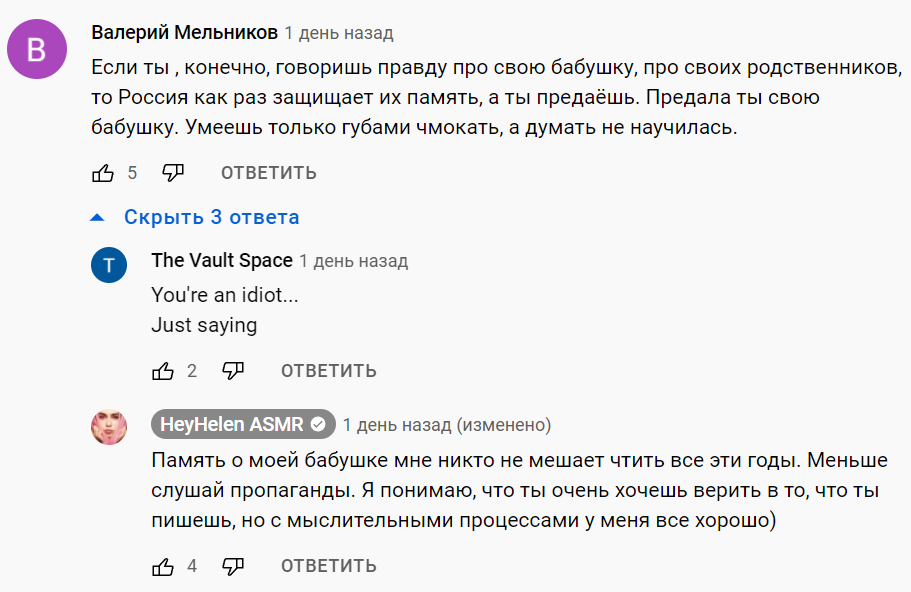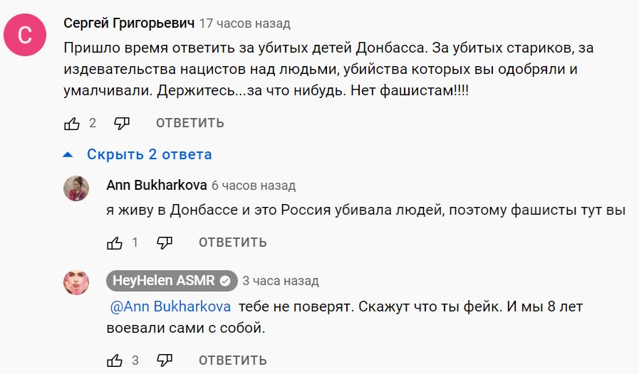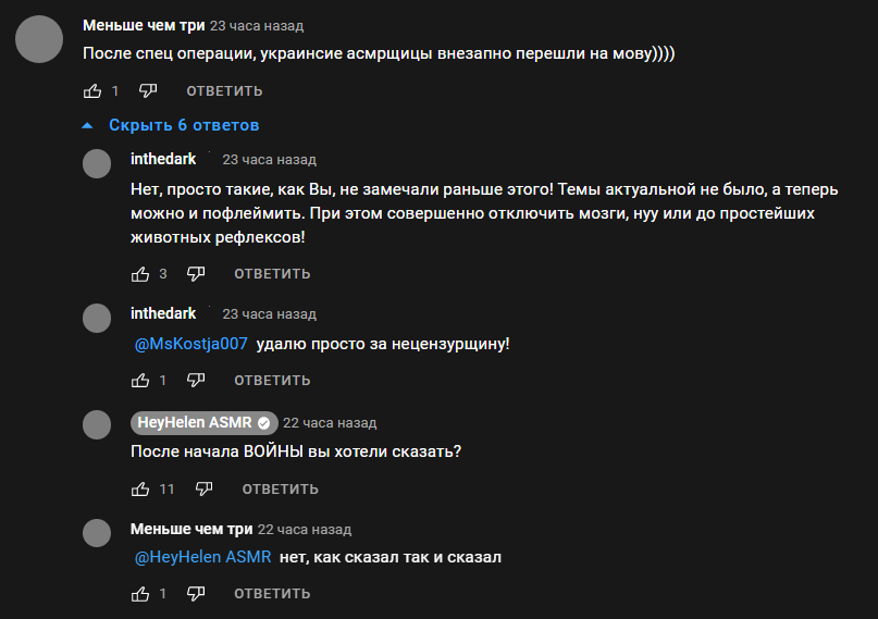 Когда-то покинул эту борду, но надо оставить тут пост для потомков. Как же я жалею, что не заскринил свои комментарии со вчера. OswaldCrale - это мой аккаунт. Когда-то он назывался по имени и фамилии под которыми я постил у неё в чате, но потом я его переименовал, и если поднять логи этого самого чата, можно это наглядно увидеть. Я не маньяк-шиз, не горящая мелкобуква, не сталкер, никогда не стремился как-то задеть сабж, обосрать в каком-то комментарии, ловил кринж с этой группы дрочеров вк из-за чего перестал клепать вызывающий коньтент для треда, даже дефал её какое-то время. У меня даже есть левый канал на ют с записями стримов, на котором я решил довести дело до конца - довыкладывать записи и потом забить хуй. Но вот, стоило мне напомнить про её ошибки молодости, про Вагнера (угомонись, ёбаный шиз, никто её не собирался за это на "Миротворец" закидывать, ты сам это придумал и расфорсил) и женщину с мужем-военным, которой она сделала сигну, вся ветка комментариев была удалена (сюрпрайз, то же самое произошло когда-то на двоще, хотя политоты или призывов к травле там не было), и я сразу же был заблокирован на всём канале. Её это совсем не смущает и ей не стыдно. Т.е. ей просто похуй. Весь этот плач в инсте и в видосе, какая она дохуя украинка, все эти попытки никого не задеть, это соболезнование харьковчанам (я сам из Ха, так-то, из-за аморфных родственников не покинул город, щупал взрывные волны от калибров, слушал сотни женских криков и разбитых стёкол после взрывов, наблюдал истерящих и дрожащих от страха соседей. Опыт, я скажу, тот ещё), мариупольцам, херсонцам - просто величайших масштабов лицемерие. Если раньше мне как-то нравилось, что она "хозяйственная", пытается вскарабкаться как можно выше, выстраивает свой стрим на работе с каждым лохом зрителем чтоб никого не задеть, то теперь это уже перешло все границы и просто переросло в наглый пиздёж. Сейчас это уже просто срубание как можно большего количества бабла с россиян, не триггеря особо этих ничтожных хохлятин вокруг себя. Ведь жить в РФ не сильно хочется, хочется сидеть дома, но вот эти каклы-националисты чё-то как-то мешают. Как же так? Ведь их всего лишь убивают, называют хохлами, ненавидят, пытаются уничтожить культуру и кухню, а они даже не смеют искать хороших русских, и оправдываться за факт своего существования как я? Невойна - это просто чушь, запускайте по нам ракеты сколько хотите, давайте я вам отсосу, только пожалуйста, мои российские хозяева, не называйте меня бандеровкой и нацисткой, это будет хуже всего, я же даже признаю, что вот есть там тысяча хороших россиян из миллиона. Записывать утром слёзные видосы с просьбами к россиянам остановить войну, а вечером за деньги извиваться в комментариях перед российскими военными и удалять тех, кому это не нравится - это суть HeyHelen ASMR. Мочух, сразу говорю, есть архивы кроме архивача, которые сохраняют даже удаленные посты.