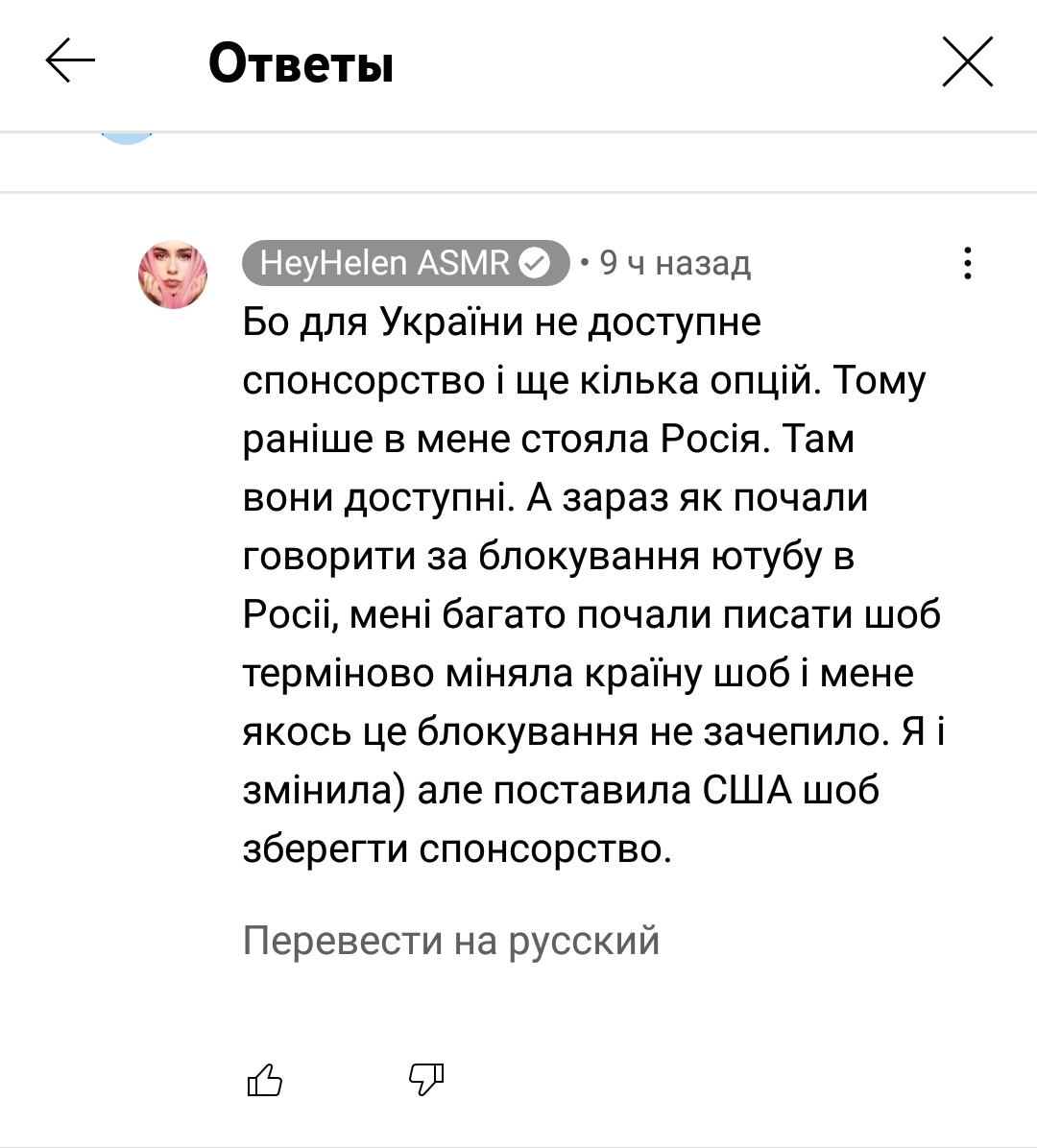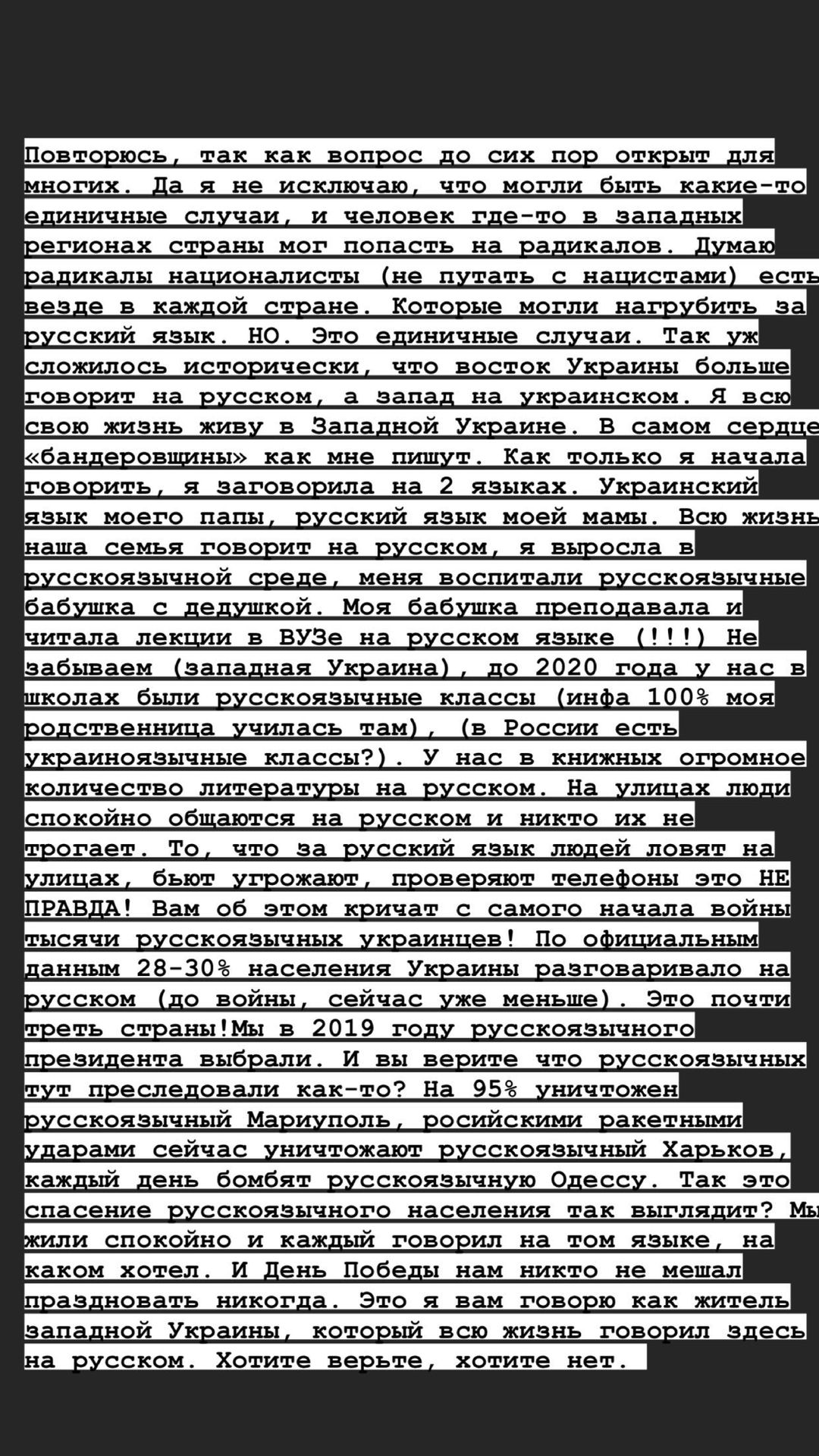 она не просто снимает видио на русском, она зарабатывала так и ей норм было а ее многие и просят перейти на украинский, думаешь перейдешь? она жадная, настолько что похуй ей на все принципы, когда дело касается денег тут дело чести - реально поддержать свой народ или раз в день пилить сторисы, чтобы никто не подумал, что она за Россию