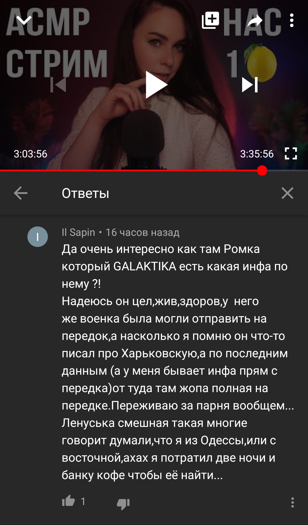 >>105881 >Роман воюет на Донбассе за светлое будущее Леночки А откуда он и на чьей стороне воюет? Кстати, этот чел под ником inthedark тот ещё пёсик Лены - в комментах под видосиками почти каждому что-то отвечает, поясняет, банит и пр. - крайне тошный тип. Наверное, самый активный из всех её подстилочек.
