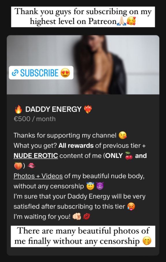 Да ей там насрать, она что угодно скажет. Но кто захочет, гляньте она ничего не добавляла на патр c 5 мая. Контент который за 500 евро и того дольше. Представляю, заплатить 500 евро и месяц не получать нифига, это круто конечно. Или там глухо и так никто не подписан или они просто ебанутые, реально притом.