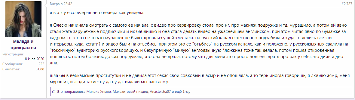 Олеся как актриса мхата каждый видос по месяцу стряпает, другие асмрщицы как из пулемета жепой видосы клепают не вставая с кровати и лутают бабло лопатой пока Олеся кочегарится месяц и ложечкой носит по рублю.