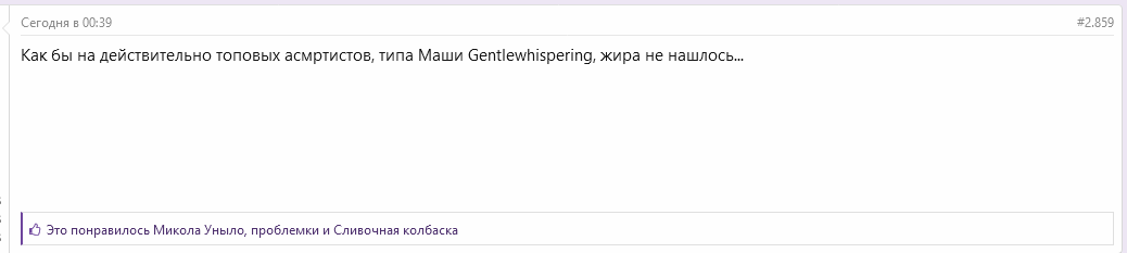 Кстати, что заметил, у асмр-шкур, если не знать про их 18+контент, очень классный голос да и вообще асмр годное. Они знают что надо делать и понимают как надо делать. И Олеся, в связи со сливами, подтвердила это правило. В отличии от той же Хелен, которая шипит как змея. Вот и дроч-контента с нет и не будет. Не в обиду Ленке, просто как пример.