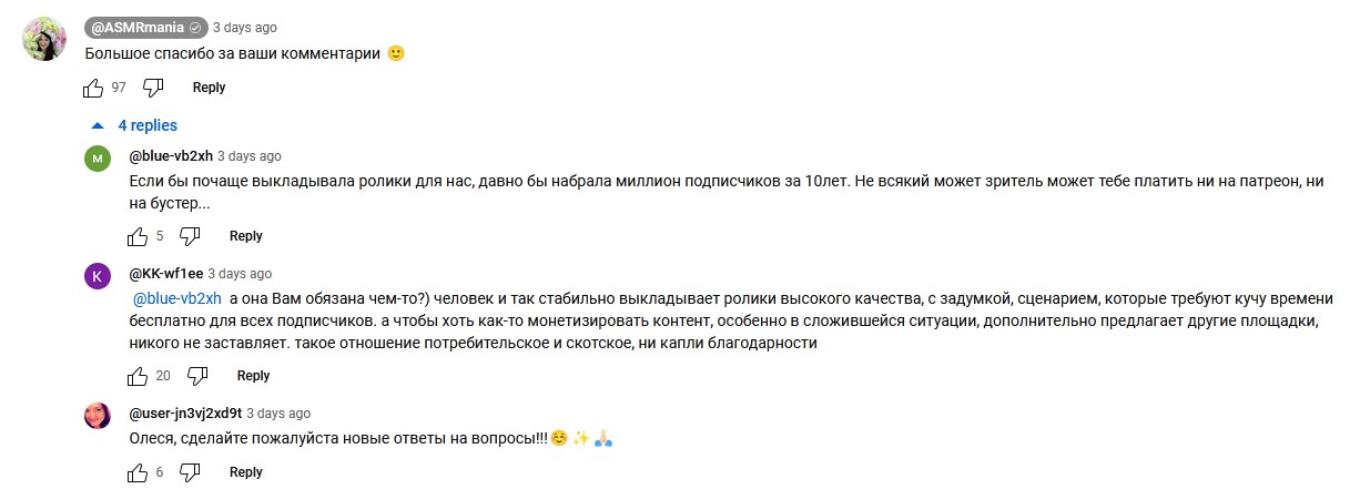 Чем метаться между двух стульев проще создать отдельный ак на любой удобной платформе типо онлика. На тытуб снимать классические асмр для своей бабоаудитории, а на онлик грузить "надувание шариков" и принимать заказы на кастомные эротишные видео, главное чтобы ценник был приемлемый, а не как у некоторых 300 бачей за 15 минут и скулеж, что клиентов всего несколько тел. Зачем она грузит трэш на свой основной ру канал, где одни бабы и негодует от хейта с их стороны не понятно от слова совсем. Либо там совсем мозг как у воробушка.