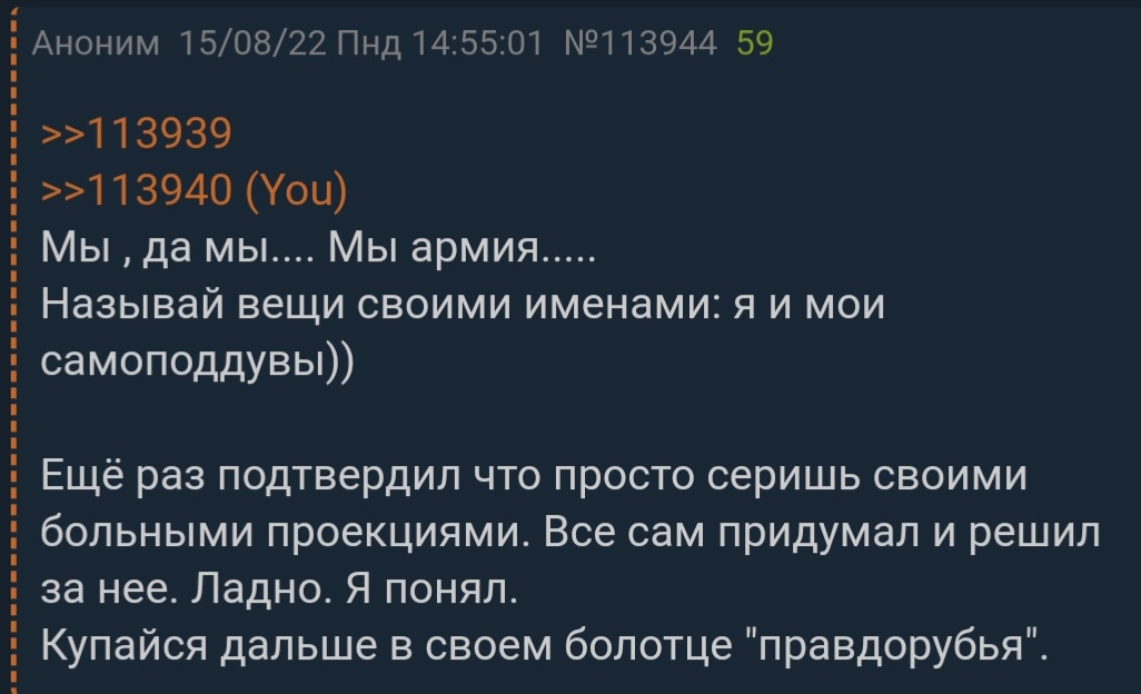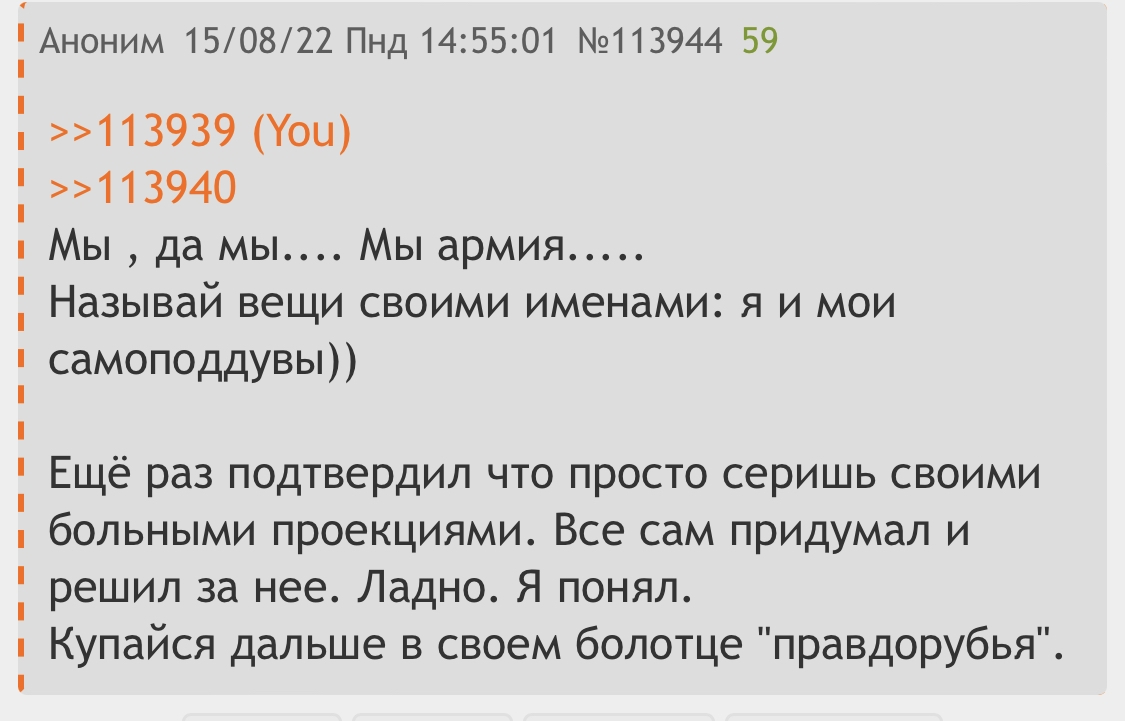>>113939 >>113940 Мы , да мы.... Мы армия..... Называй вещи своими именами: я и мои самоподдувы))
