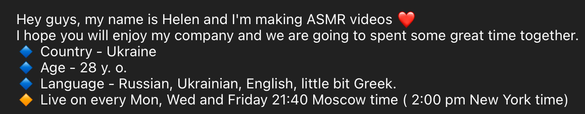 >>114878 а ты думаешь я знаю что у нее в голове? я только вижу истеричную помешанную на донатах бабу, у которой уже нет идей для видео, высасывает из пальца и тупо копирует видосы одни за другим, ей уже похуй на асмр, это тупо ее работа и все