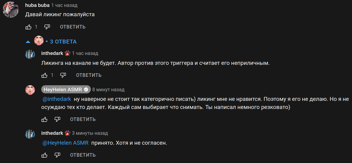 И это не говоря о том, что когда их просишь скинуть ссылки на конкретные переборы в оскорблениях, в которых они тебя обвиняют, они сливаются и кидают какой-то пост, где пишут, что она просмотры крутит. Ебать. В целом как я и сказал уже. Цель просто добить тред, чтобы все отсюда разбежались, сделать массовость «фанов» ленки, чего кстати нет ни в одном треде на борде АСМР, тут ни в одном треде нет такой хуйни. Ладно давайте тоже будет с ними снисходительными. Ну нравится им слюнявая девочка из другой страны, которая живет на их деньги, им думать, что они оплачивают ее салон красоты. Ну вот нравятся им превьюхи с высунутым языком. Когда сиськи засветит (но не все, их будоражит когда есть тайна)