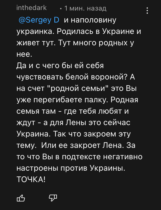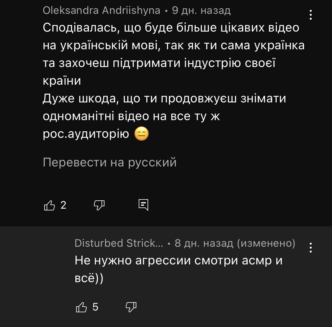К слову это не вопрос политики, вопрос человечности. Ты либо со своими, либо с чужими, когда ты с другими ты не можешь говорить, что ну я их ненавижу, но они мне деньги кидают, я вынуждена. А ведь она мыслит именно из этой логики и еще в самом начале говорила, что ее аудитория в основном с России, вот она и не переходит на украинский, лол) И ленка такая во всем: не снимаю другова, потому что другое не смотрят. Не перехожу на украинский, потому что аудитория из России.. ммм. понятно.
