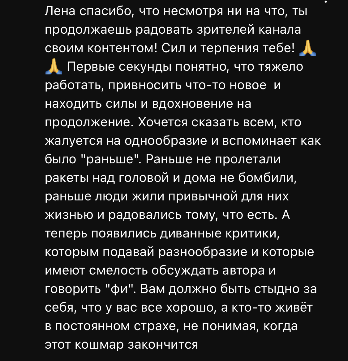 Раньше Лена благодарила после стрима за хороший вечер. Желала спокойной ночи и хороших выходних. Что сейчас изменилось? Закончилась нужда в ласке? Уже не хочется желать этого всего? Благодарить? Или кому-то уже наконец-то это желает т.к. раньше не было кому. Ну что это. Мы требуем объяснений