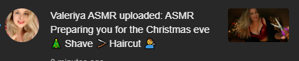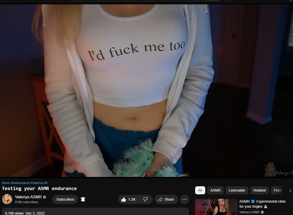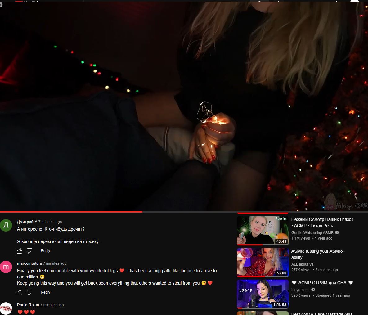 Предлагаю раскручивать топовых асмрщиц на подарочки. Допустим каждому 50000 тысячному подписчику подарок лифчик поношенный. Или новогодний стрим с розыгрышем подарков , в виде открыток с отпечатками губной помады от губ, и подписью на память. Думаю идея хорошая. А ещё мое личное пожелание, это уже делать некоторые видео для Вр очков, мне бы допустим очень хотелось бы погрузится полностью в Валерии комнату. А так же походить по комнатам у нее дома, посидеть с ней за кухонным столом и слушать ее щебетания.