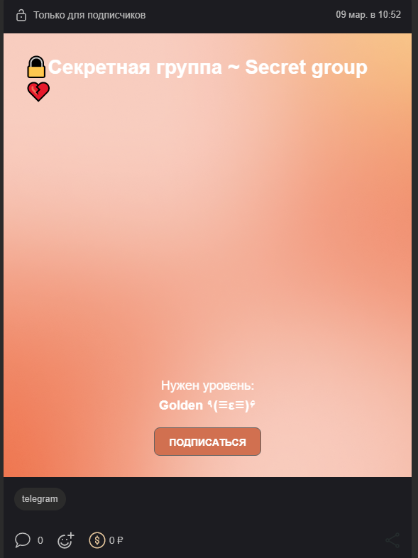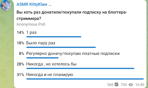 Норм так, за сутки. Если на сек представить что все бы они заплатили.... Была бы мультимилионершей. Влажная мечта Ангелины это чтоб Патрик и бусти работали как телега. Позакрывала бы опции копирования, пересылки, сохранения и скриншотов. И вход в группу за бабки. Пока в группе - контент в твоём распоряжении - обдрачись.