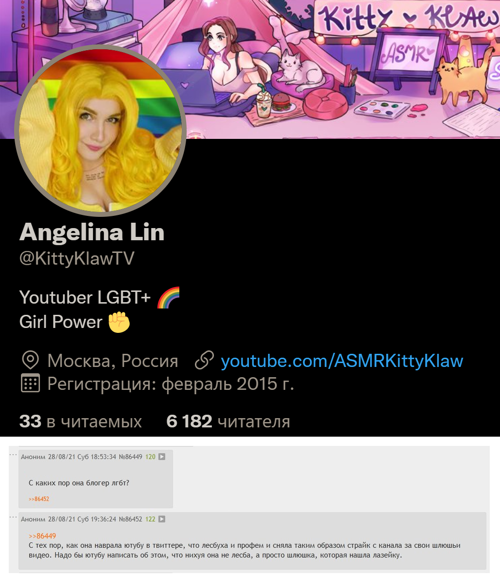 Ангелине нужно писать мемуары в старости о своем пути асмртистки или читать лекции о своём приспособленчестве) Как травить коллег по цеху и прикидываться дурочкой. Как лишившись монеты, наебать Ютуб прикинувшись лесбухой и фемкой. Как прятать мужа от мобилизации. Как перестать быть лесбухой из-за ВВП.