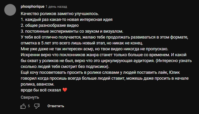 Ещё в голос с того что она всегда когда заходит речь про асмр контент кичится 5 летним стажем, хотя контент её не шибко лучше стал. А ещё в случае чего всегда ответит (как и её ручной пёсик) что такой контент попросту не зайдёт зрителям потому что они ибланы большинству такое не интересно, а не потому что она лентяйка. (Можешь прочекать канал sadfman и увидеть просмотры) но на создание такого ролика у неё уйдет весь день и не факт что получится, даже если делать скидку что это в первый раз сделала бы. Звук открывающихся баночек, жарки всё такое разнообразило бы её контент но это слишком сложно так что соре. Даже Обломов в экспериментальном ролике сделал на голову выше чем блогерка с 5 летним опытом. https://youtu.be/2aLpdsOR6-o Так что не стоит защищать её просто потому что она женщина. P. S вот и я принял таблетки, комбинацию самых эффективных ноотропов из доступных в РФ. Я уже было подумал что они не работают, но вчера когда я включил стрим и не смог выдержать даже 10 минут болтавни не о чем я понял - работает. Надеюсь такого результата ждала моя администрация и я удовлетворил её пожелания.