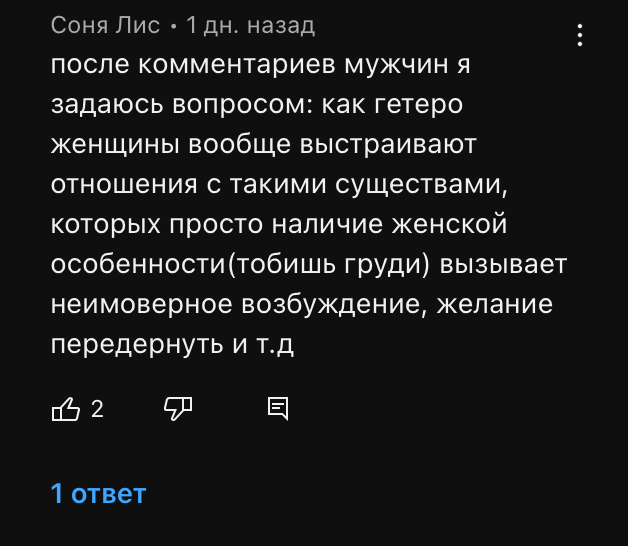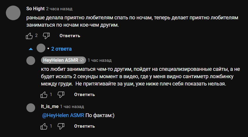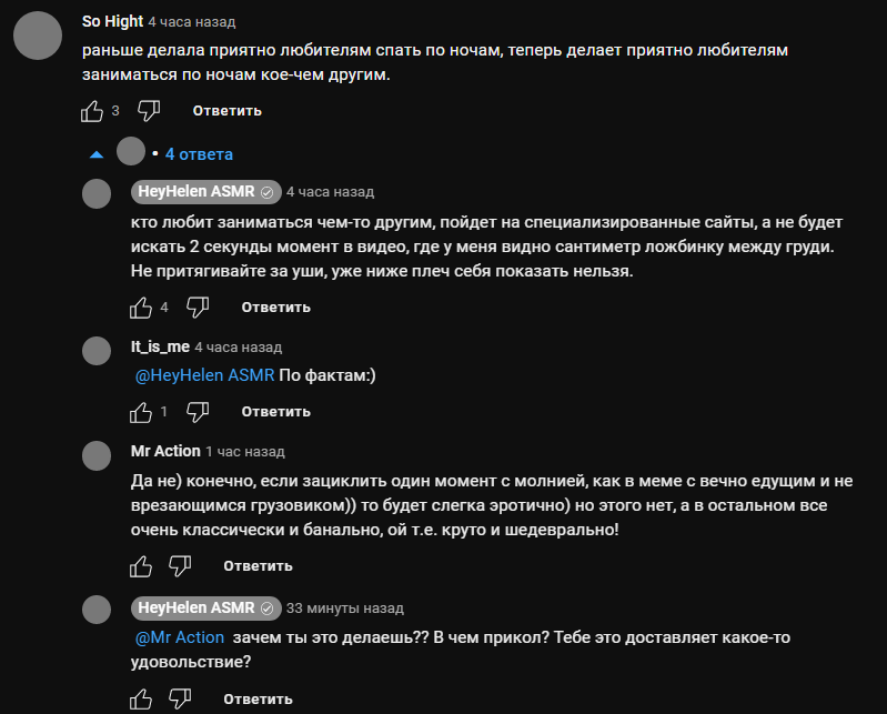 лена трогает себя на видео. Об этом чел написал В ответах: фу, читать противно, пошляки. Шта? Совсем уже того? Ах да, знаете что заметил с годами в комментариях? Чем больше лена и модераторы не уверены в том, что полностью в чем либо правы, будут доказывать и убеждать. Всегда.