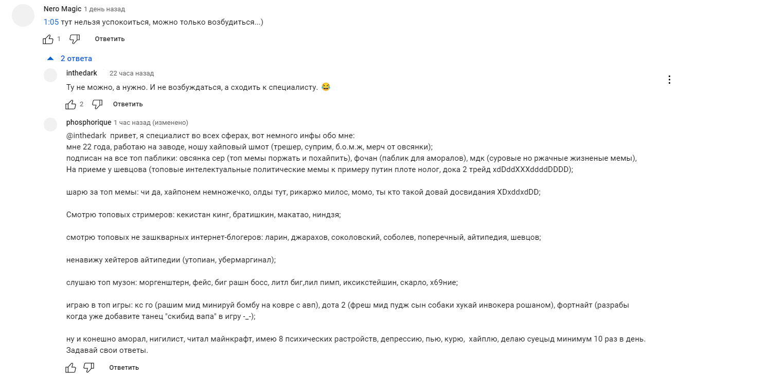 Решил глянуть комменты под последним видосиком и увидел вот это... фосфорик, ебать ты жалок и подлиза, а она тебе даже сердечко не поставила, и ещё ты подписан на рейндропа и кучу прочей хуеты, хотя, зная тебя, я уже даже не удивлён.