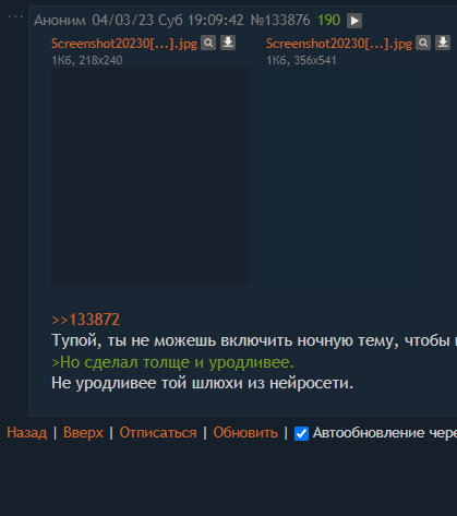 >>133849 >Конечно, ведь когда человек тратит время, чтобы тред имени её выделялся на фоне остальных- это так неприятно, на это так похуй. >на это так похуй. Да) именно. Это в твоём манямирке имеет неебаться какое значение. почему-то Это не актив Лены. Это не её канал, не ее инста, это место где смешали с говном ее покойных родственников и ее саму и продолжают это делать, попутно хуесося друг друга. Поэтому похуй как это выглядит. Вид, благосклоннее не делает это место, говносуть превалирует.