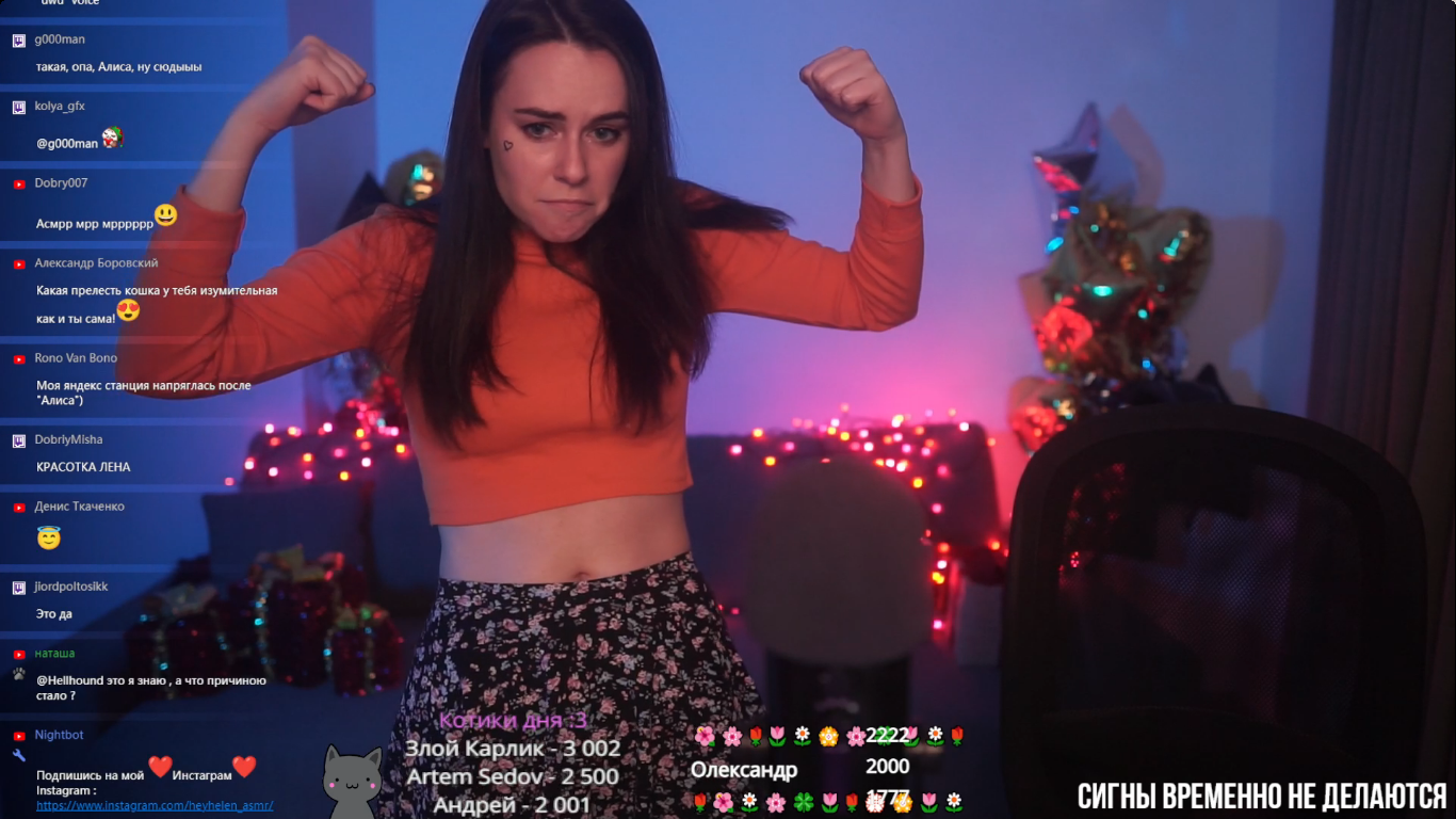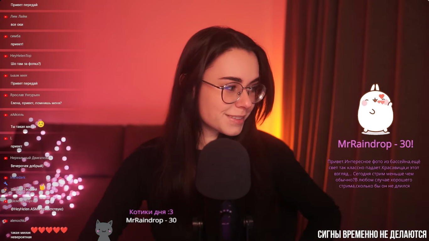 Хееей. Ребзятки пиздятки. Как вам в целом Лена? Под конец стрима, а конкретно, когда в последний раз держала кошку свою любимую стоя, на неё было стремно взглянуть. Круги под глазами, щеки, лоб большой, в целом выглядела как уставшая женщина. Может кто захочет кинуть этот фрагмент. Если под прямым светом в ебло она хорошо смотрелась, в тот момент с пушистиком было прям удручающе. Как зашевелит башкой, так ещё нелепей и страшнее смотрелась, а из-за эмоций частых, как ебаная бабка ёжка я её всю. Совсем изменилась, не такой я её помню. Не такой