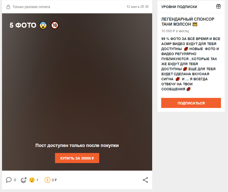 и что я бы получил тут а эти десятки тыщ рублей пару фото сомнительного содержания с ощущением лёгкого разочарования? оно мне надо? спс, но нет. Элизабет АСМР пилит стабильно по 2 видео и 2-3 фотосетика в месяц за 350 рублей. причём подходит с душой. да ты не ждёшь обнажёнку за такие копейки, но получаешь доп асмр контент который на ютуб не выложить
