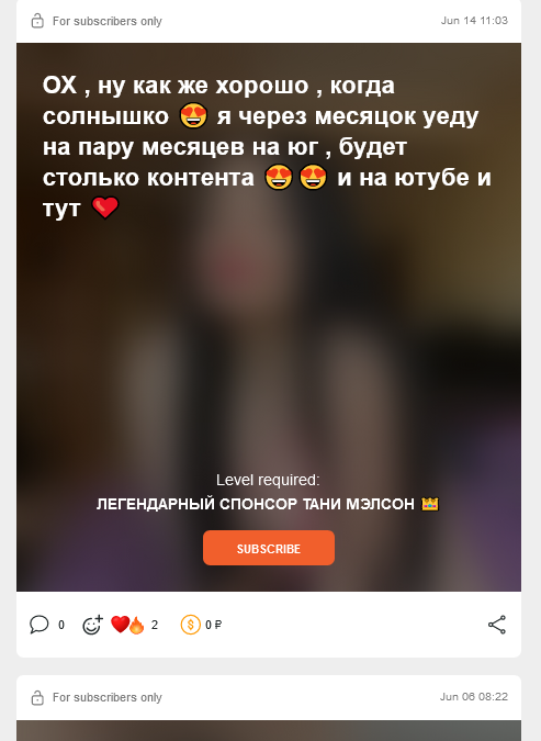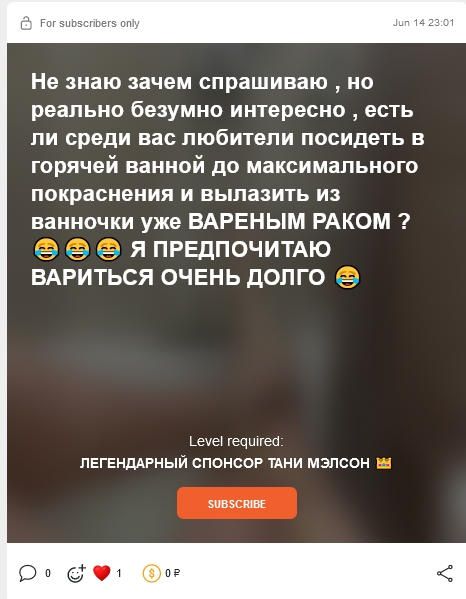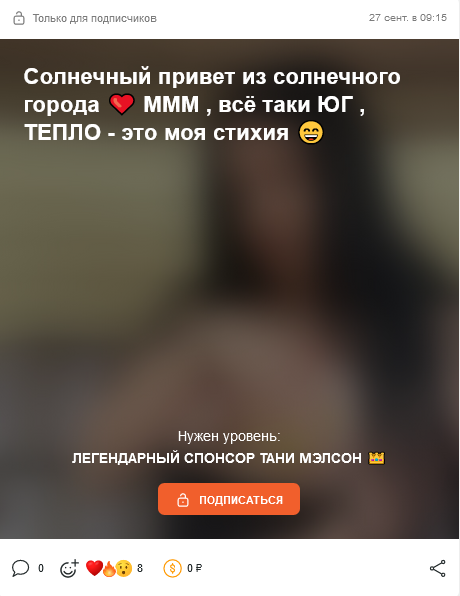 Таня в этом плане вообще не меркантильный человек. Несмотря на смешные суммы за посты. Скорее всего как я выше уже писал, это просто её желание уберечь свой контент от сливов. Вряд ли это такая жадность. Я не вижу в ней этой черты. Может хорошо скрывает? Не суть.