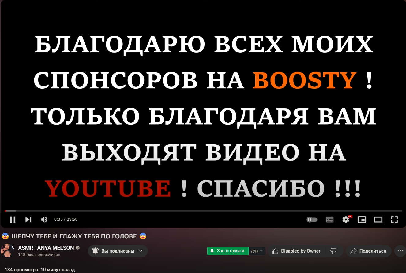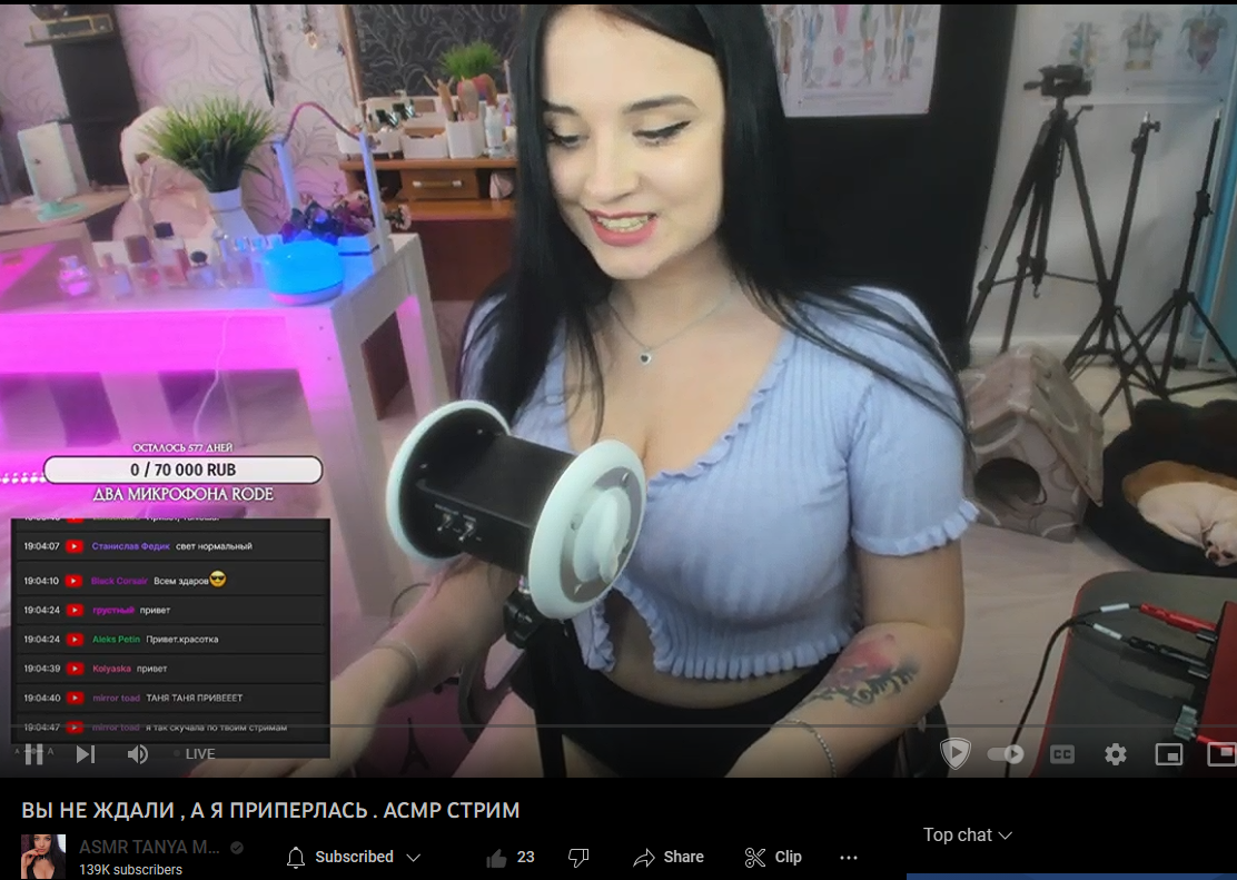 Мало кто из текущих асмрщиц на ютубе льёт часовые видео. А это значит, что для неё это действительно увлечение, которое ей самой доставляет. И по содержанию это не унылый тапинг или шёпот стандартный. Всегда какая-то выдумка (ну кроме чтения книг), всегда какой-то реквизит. Все эти вещи и действия говорят о том, что ей делать видео нравится и поэтому нет ничего постыдного, что зарабатывает она в другом месте. Ютуб увы на сегодняшний день для русских просто способ заявить о себе. Зарабатывать там стало намного сложней, чем раньше. Конечно есть сложные схемы, но суть же в том, что с российских IP копейка не капает, а основная аудитория это россияне. Так что даже переезд тут не вариант.